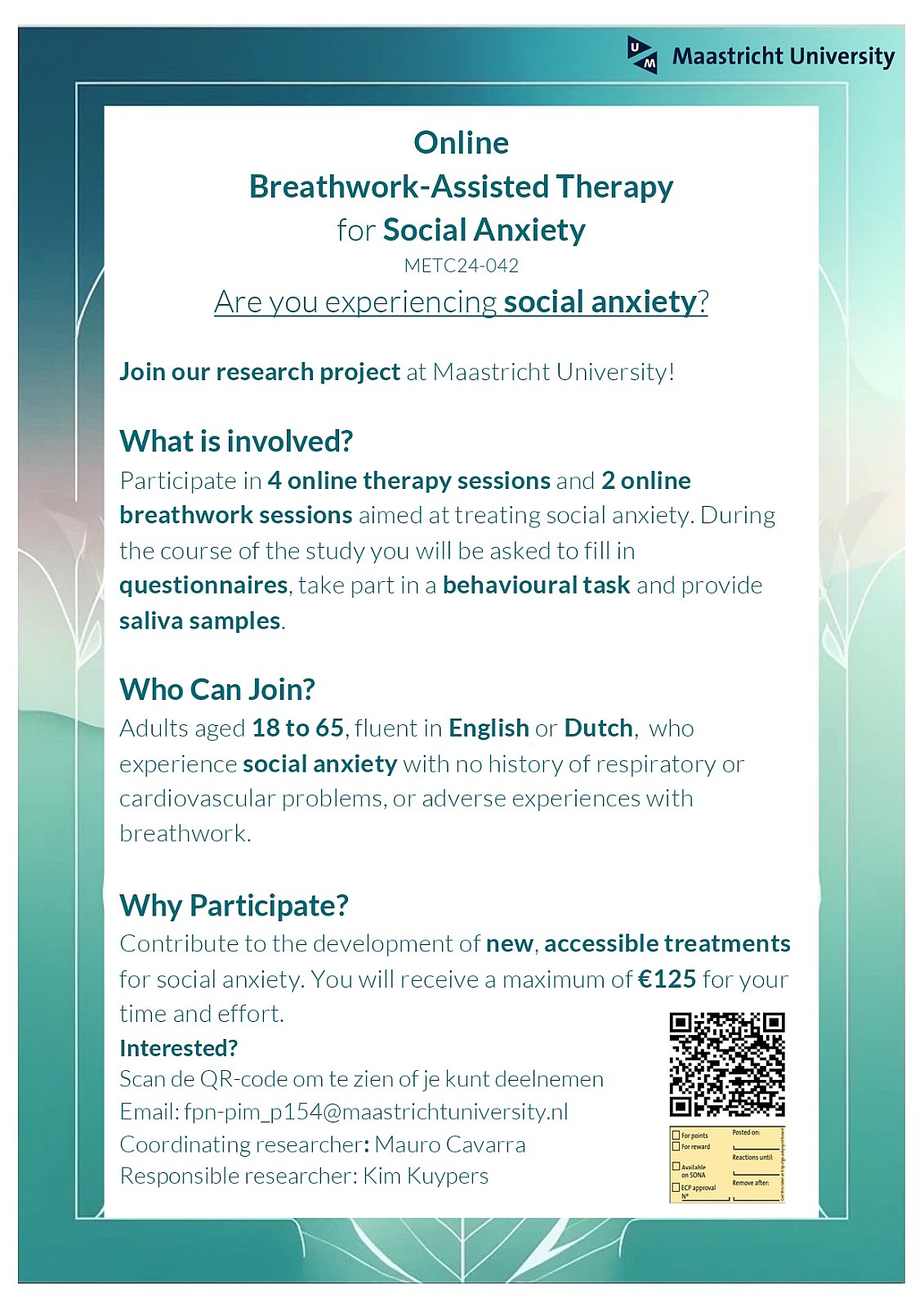 These studies take place at Maastricht University and involve on-site sessions where substances may be administered. They are open to people who are able to travel to Maastricht for study visits.